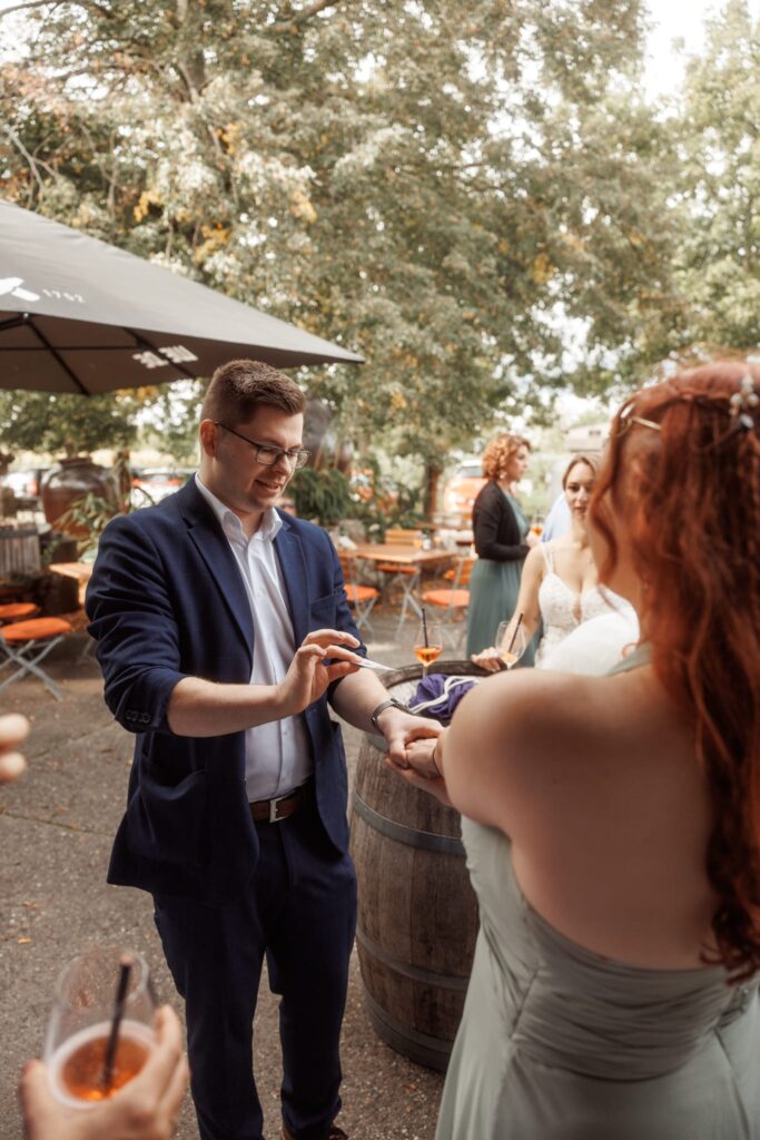 Die Aufmerksamkeit eurer Gäste verändert sich über den Tag hinweg, das solltet ihr bei der Programmplanung berücksichtigen. Nach der Trauung, während des Sektempfangs, sind die Emotionen noch frisch und die Stimmung ausgelassen. Das ist ein guter Moment für leichte, unterhaltsame Elemente, die keine volle Konzentration erfordern.