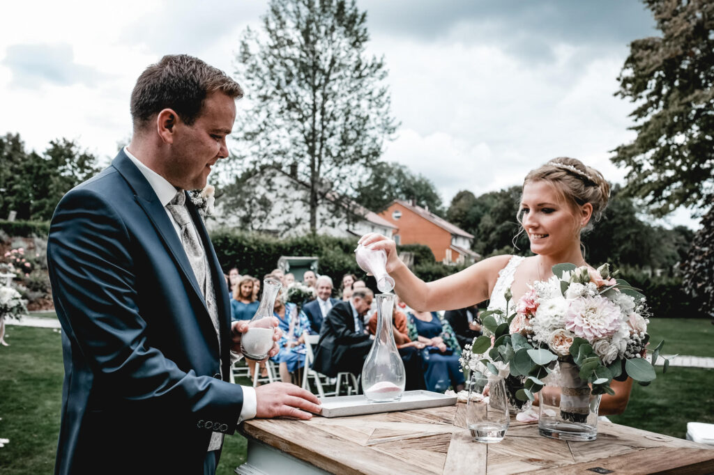 Ein Pluspunkt freier Trauungen ist die Möglichkeit, persönliche Rituale einzubinden. Ob Sandritual, Baumzeremonie oder das Anzünden einer Hochzeitskerze, verschiedene Trauungsrituale geben eurer Zeremonie eine zusätzliche symbolische Ebene. Der Trauredner erklärt die Bedeutung und führt durch diese Momente.
